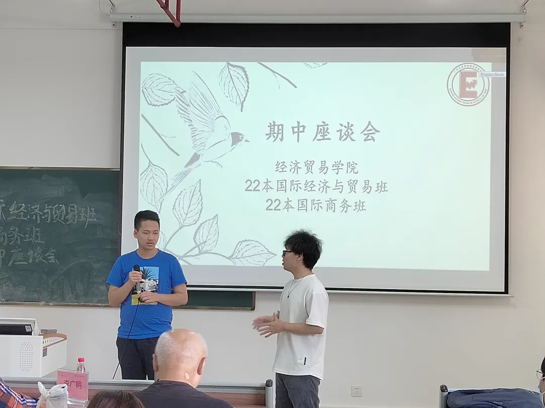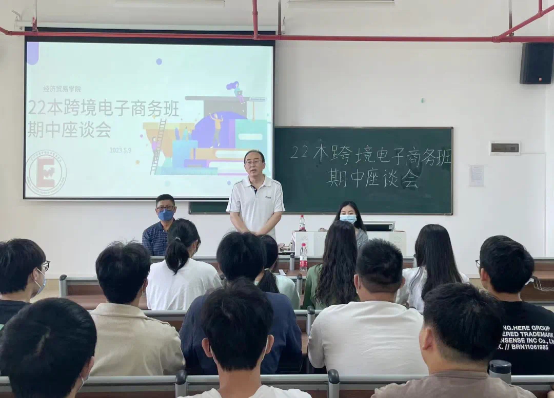 为深入开展学习贯彻习近平新时代中国特色社会主义思想主题教育,坚持立德树人初心,牢记为党育人、为国育才使命,促进经济贸易学院班风学风建设,深入了解四会校区经贸学子的学习情况与校园生活状态,经济贸易学院李广明院长率学院院长助理石立副教授、学工办主任宋元跃老师、各系负责人和教师代表于2023年5月9日前往四会校区,在22级国际经济与贸易班、跨境电商班、国际商务班、经济统计学班分别召开期中座谈会。