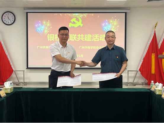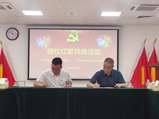 2023年5月26日,会计学院党委和广州农商银行增城支行(简称“农商行增城支行”)党委在合汇广场增城农商行总部进行红联共建主题活动及签约仪式。本次活动是根据学习贯彻习近平新时代中国特色社会主义思想主题教育的要求,结合共建双方实际,实现资源共享、优势互补、互助共建,促进党建与业务发展“同频共振”,开展“校银携手,合作共赢”为主题的红联共建工作。广州农商银行增城支行党委副书记兼纪委书记赵明、党委委员兼行长助理谢超颖、党委委员兼零售业务部经理田春雷,广州华商学院会计学院党委副书记陈洋广、党委委员兼副院长周书域、学工办副主任兼党支部书记杨烨瀚等一行出席活动。农商行增城支行部门经理、员工党员代表,会计学院部分党支部书记、20名学生党员代表共同参加本次活动。