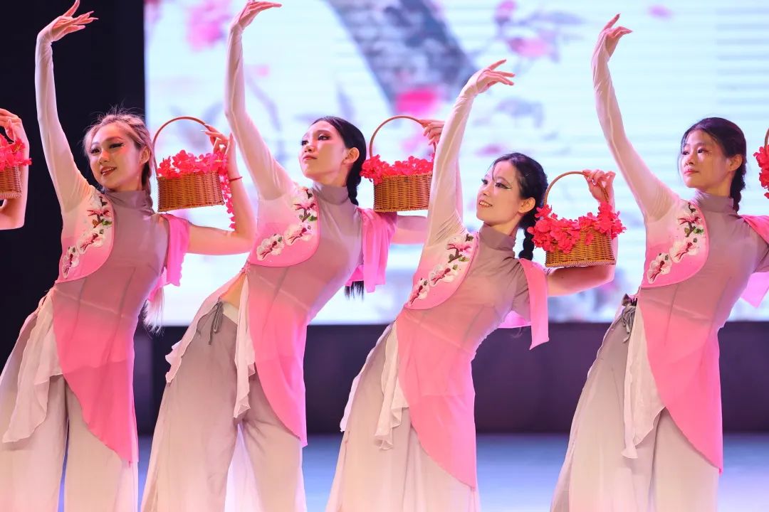 春风自有信,花开有香来。泉水叮咚,粉衣的舞者们手捧花篮,化身为一位位含苞待放的窈窕淑女。花般的女子们柔情似水,温情脉脉,嬉闹于花瓣飘舞的潺潺流水边。民族民间舞《春风花信来》注重创新和意境,融入多元文化和国际化舞蹈语汇,富有时代气息。