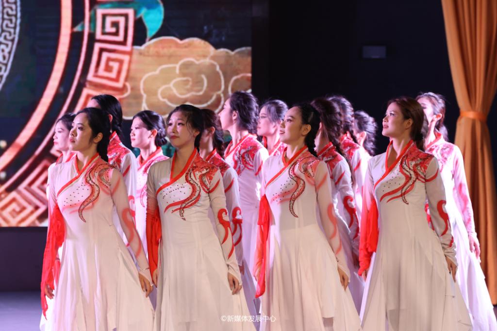 《盛世欢歌》隆重开场。喜庆激昂的乐声响起,舞蹈队的队员们犹如美丽的白鹤,踩着配乐鼓点,轻盈雀跃的舞步纷纷亮相,俨然百花齐放,摇曳生姿。