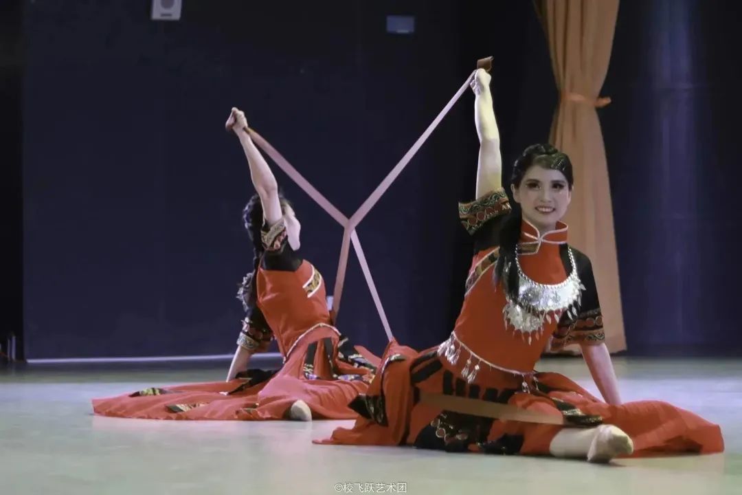 “拉”“绷”“开”“合”,两位舞者身着黎族传统服饰跃然起舞,她们用手里的红丝带模仿再现织娘纺织的过程,将聪慧、勤劳的江南织娘形象演绎得活灵活现。民族民间舞《织娘》展现的是黎族的纺织文化。