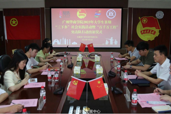 为扎实推进学习贯彻习近平新时代中国特色社会主义思想主题教育,学习宣传贯彻党的二十大精神,学习贯彻习近平总书记同团中央新一届领导班子成员集体谈话时的重要讲话和团十九大精神,切实发挥共青团作为广大青年在实践中学习中国特色社会主义和共产主义的学校作用,引领广大青年学子参与社会实践,切身感知社会、热爱家乡、服务群众,用实际行动坚定不移听党话、跟党走,7月3日,我校团委在行政楼513召开“学习二十大 永远跟党走 奋进新征程”广州华商学院2023年大学生暑期“三下乡”社会实践活动暨“百千万工程”突击队行动出征仪式。学校党委苏宁书记,校团委陈刚书记,学校党委统战部黄秋铭副部长,学校党委组织部王国庆副部长,校团委挂职副书记任欣鹭老师,党委办公室类康老师,各二级学院团委书记、学生会指导老师、领队教师代表、学生代表等参加此次出征仪式。